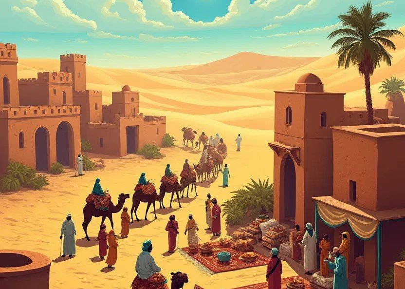 - Les grandes villes caravanières : Tombouctou, Gao, Djenné et Koumbi Saleh étaient des centres d’échange majeurs où les marchandises étaient stockées et redistribuées.